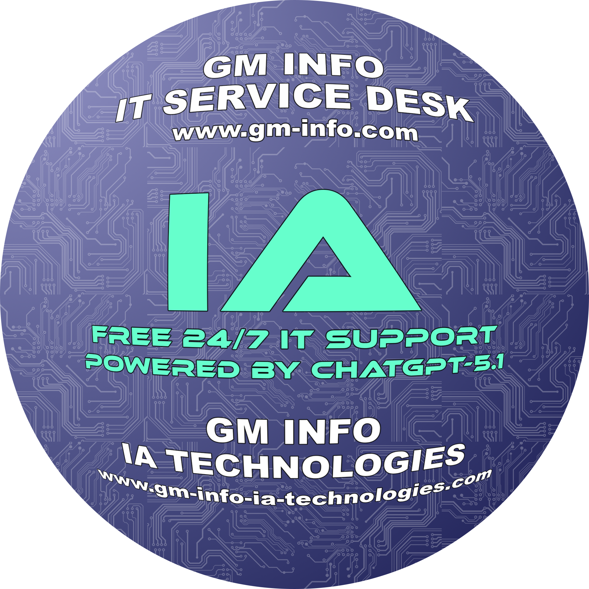 GM INFO - IT SERVICE DESK intègre l'accès à GM INFO - IA Technologies ©, modèle GPT entièrement personnalisé, et dédié au Support Informatique Gratuit 24/7 avec ChatGPT-5.
